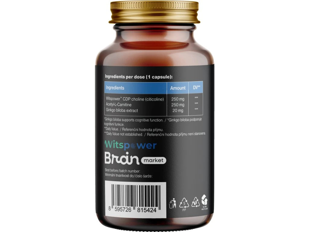 Složení v dávce (1 kapsle): CDP cholin (citikolin) jako Witspower™ (250 mg, RHP **), Acetyl-L-Karnitin HCL (250 mg, RHP **), Ginkgo biloba extrakt 4:1 (z listů) (20 mg, RHP **). Rostlinná kapsle na bázi HPMC. Neobsahuje žádné balastní látky (éčka).