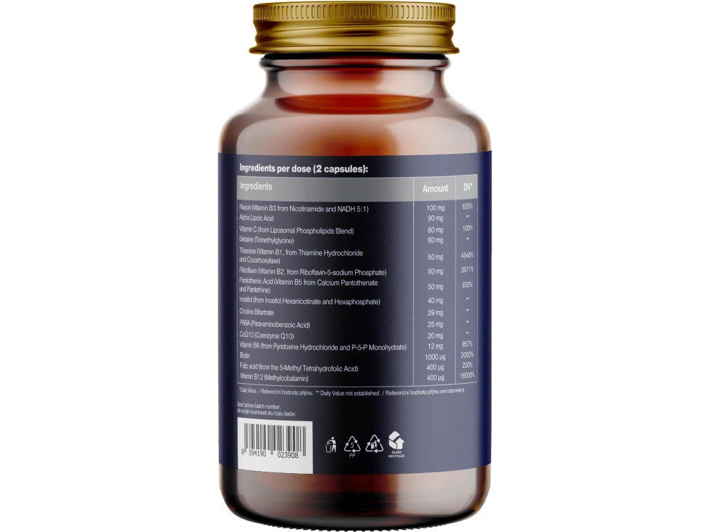 Složení: Vitamin B3 (nikotinamid a nikotinamid adenin dinukleotid hydrid), vitamin B13 (kyselina alfa-lipoová), liposomální vitamin C, bezvodý betain, vitamin B1 (thiamin HCL a kokarboxyláza), vitamin B2 (riboflavin a riboflavin-5-fosfát), vitamin B5 (pantothenát vápenatý a pantethin), vitamin B6 (pyridoxin a pyridoxal-5-fosfát), inositol (inositol hexanikotinátu a inositol hexafosfátu), vitamin B10 (kyselina paraaminobenzoová), cholin bitartrát, koenzym Q10, vitamin B7 (biotin), vitamin B9 (5-methyltetrahydrofolát), vitamin B12 (methylcobalamin), celulóza, rostlinná kapsle na bázi HPMC. Neobsahuje žádné balastní látky (éčka).