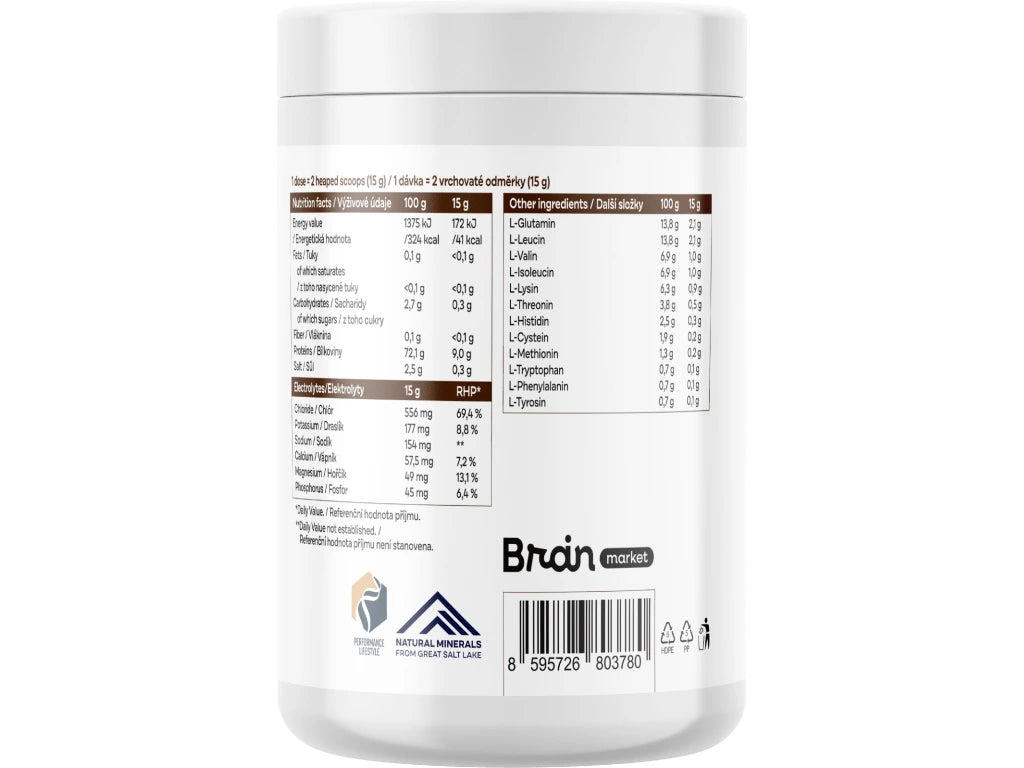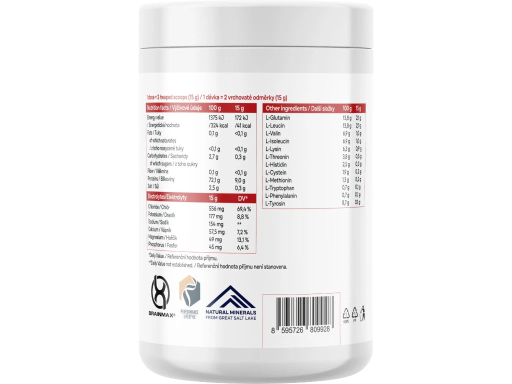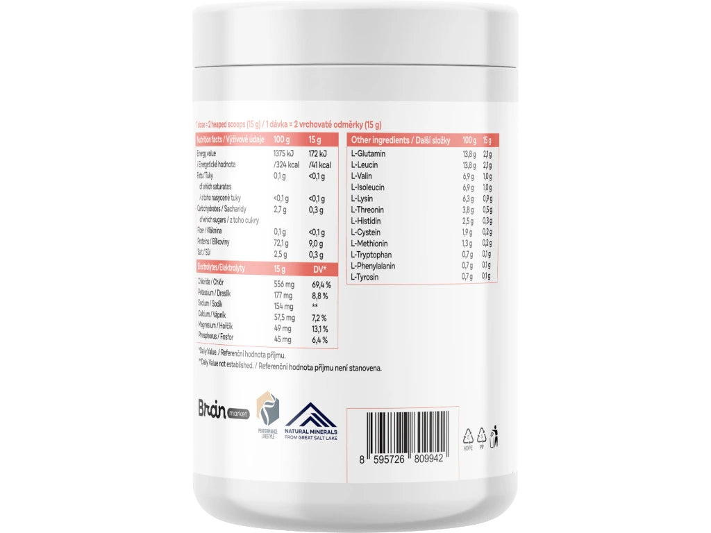 Kombinace optimálního poměru elektrolytů a aminokyselin pro zvyšování výkonu, svalového růstu a optimalizaci zdraví. Aminokyseliny byly získány fermentační technologií a jsou obohaceny o koncentrát elektrolytů z Velkého Solného jezera. Slazeno pouze přírodou: stévie a inulin. Inulin z kořene čekanky navíc působí jako prebiotikum. Díky absenci syntetických sladidel je konečně mikrobiom friendly. Každá dávka obsahuje 8,6 g EAA!