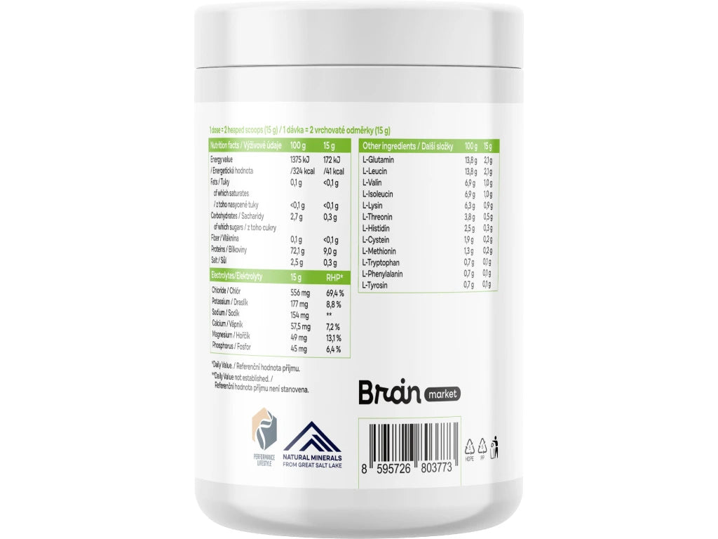 Složení: L-Glutamin, L-Leucin, kyselina citronová, BIO inulin, přírodní aroma, L-Valin, L-Isoleucin, Elektrolyty a stopové prvky z Velkého Solného jezera v Utahu (chlorid, draslík, sodík, hořčík a další přirozeně se vyskytující elektrolyty a stopové minerály), L-Lysine HCl, L-Threonin, L-Histidine, sladidlo: steviol-glykosidy, L-Cystein HCl, L-Methionine, L-Tryptofan, L-Phenylalanin, L-Tyrosine. Vypočtené hodnoty jsou zaokrouhlené průměry včetně přirozených odchylek surovin.