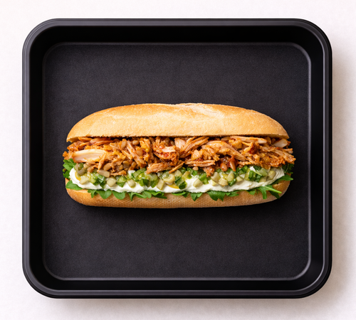 Bageta s trhaným kuřecím masem, okurkový relish, čerstvý sýr s hořčicí, rukola