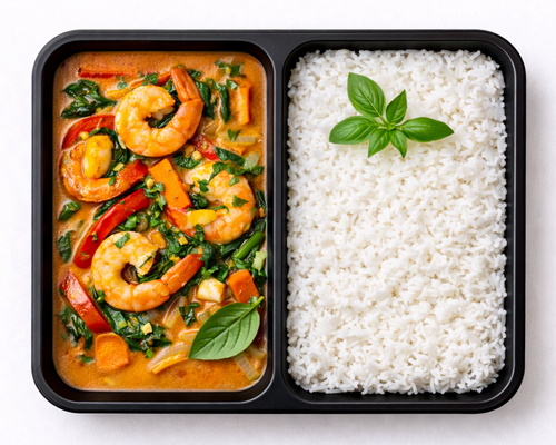 Červené kari z krevet s jasmínovou rýží a thajskou bazalkou