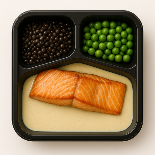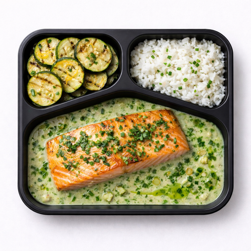 Pečený losos, omáčka z konfitovaného česneku a bylinek, jasmínová rýže, cuketa