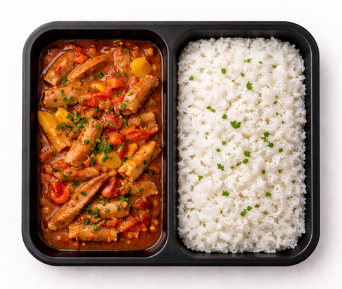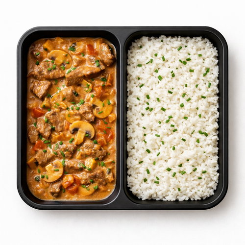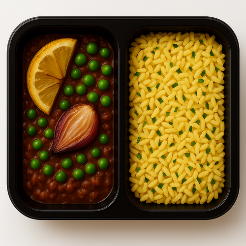 Hovězí ragú, hrášek, citron, pečená cibule, pikantní rýže s bylinkami