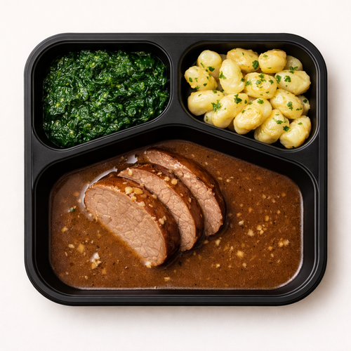 Hovězí na česneku, špenát a bramborové gnocchi