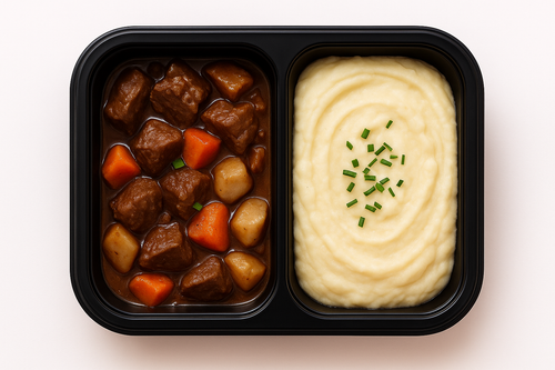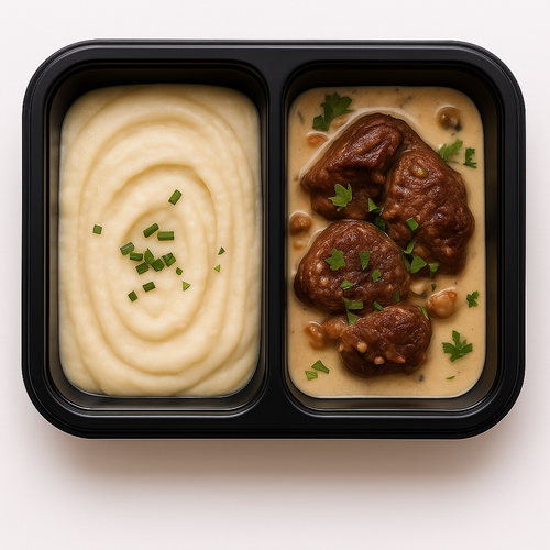 Hovězí stew s karotkou a topinamburem, bramborovou kaší s podmáslím