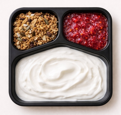 Kokosová granola, džem z malin a rakytníku, jogurt