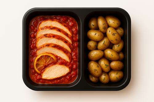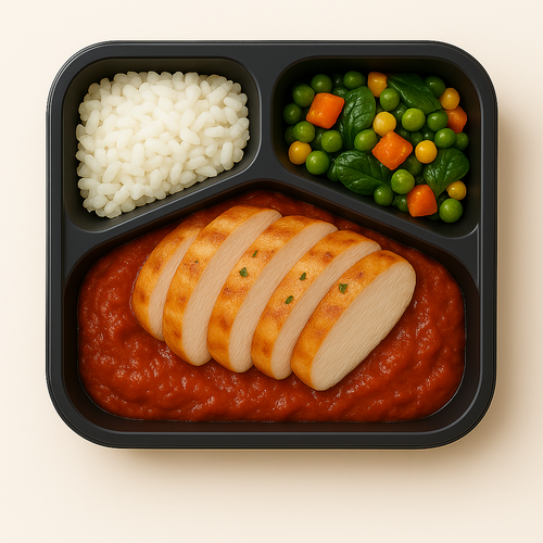 Kuřecí prso s krémovou rajčatovou omáčkou, zelenými fazolkami, jasmínovou rýží a pažitkou