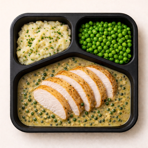 Krůtí prso, omáčka ze zeleného pepře, šťouchané brambory s křenem a cibulí, hřášek