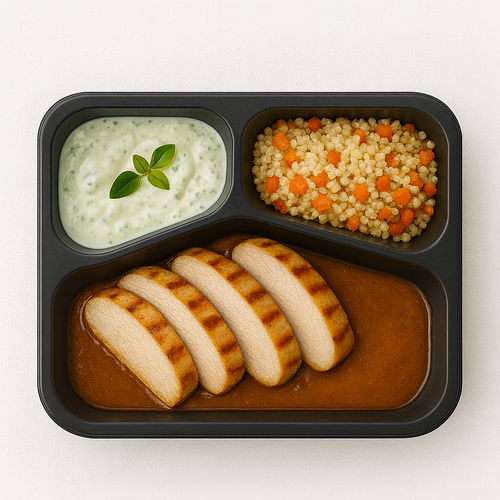 Krůtí prso s grilovanou karotkou, quinoa a jogurtovým okurkovým salátem