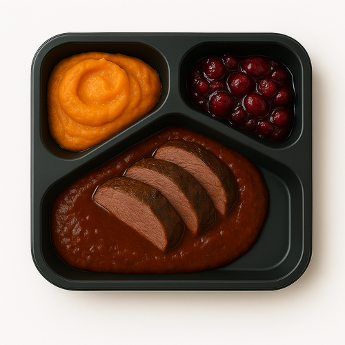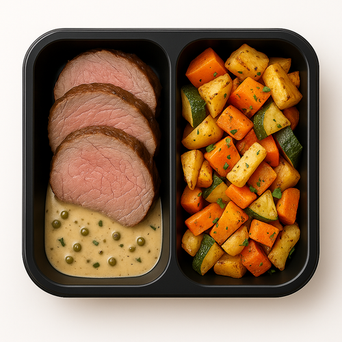 Telecí pečeně, omáčka z tymiánu a zeleného pepře, pečená zelenina