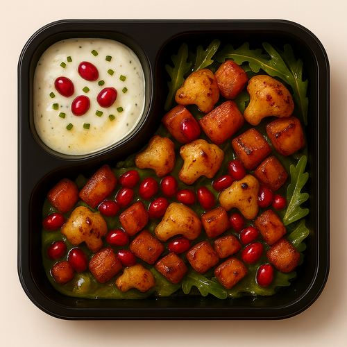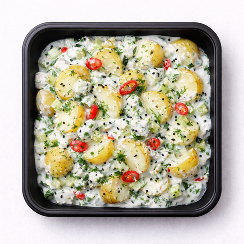 Lehký bramborový salát, chilli, jogurt, sezam, hořčice a černucha