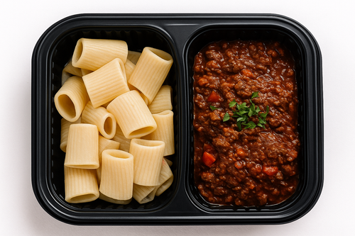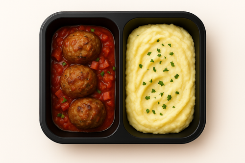 Masové koule, omáčka z čerstvých rajčat a cibule Amatriciana, parmazánová kaše