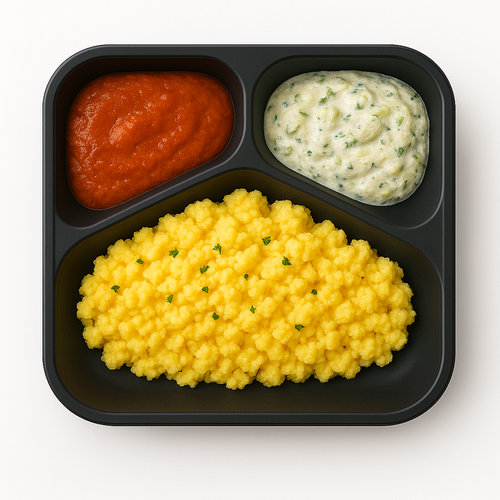 Míchaná vejce s omáčkou z pečených paprik, chipotle ranch dip s artyčoky