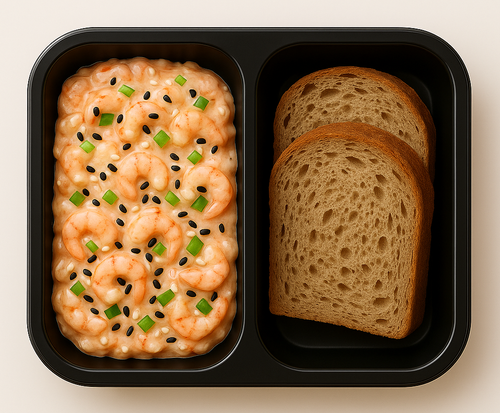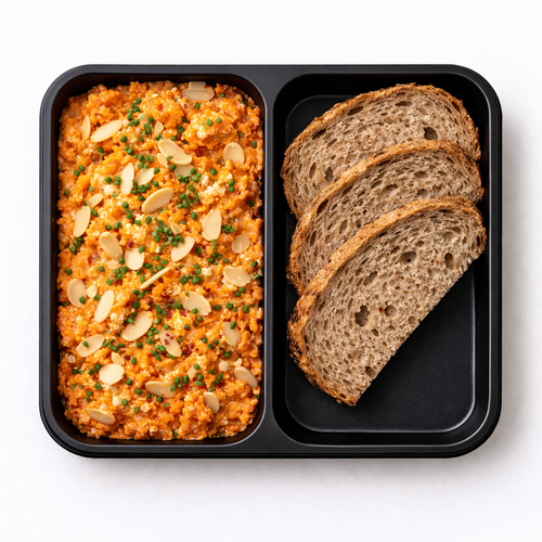 Pomazánka z tvarohu, karotky a mandlí, celozrnný chléb