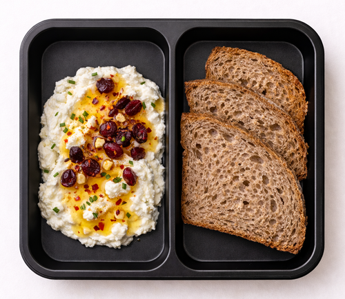 Pomazánka ze šlehané fety s pikantním medem a brusinkami, celozrnný chléb