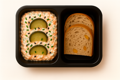 Pomazánka ze zauzeného lososa, pažitka, marinovaná okurka, miso chléb
