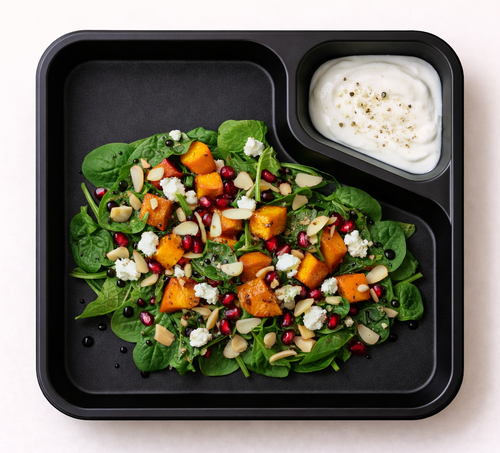 Salát s listovým špenátem, pečená dýně, feta, granátové jablko, mandle