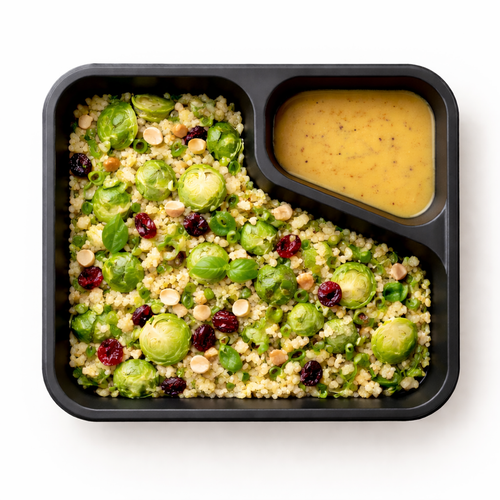 Salát z růžičkové kapusty, kuskus, medovo hořčicový dresink, lískové ořechy