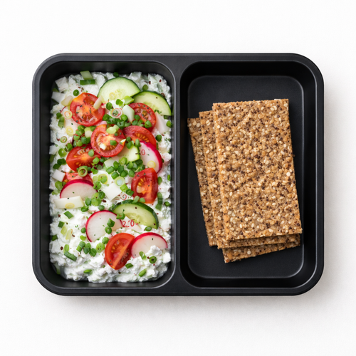 Sýr cottage s čerstvou zeleninou, jarní cibulkou a sýrovými krekry