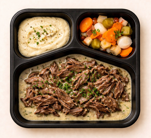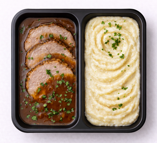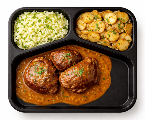 Hovězí loupaná plec, s pepřovou omáčkou, gratinované brambory s parmazánem