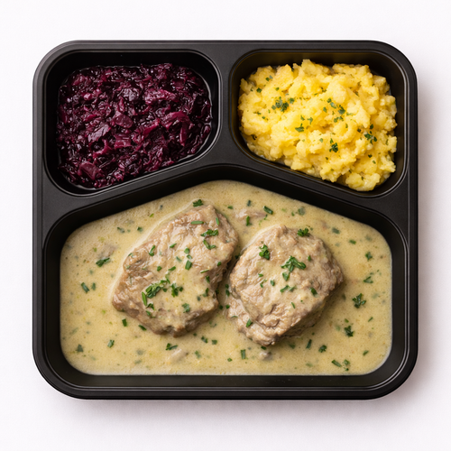 Telecí plec, estragonová omáčka, červené zelí s povidly, mačkaný tuřín