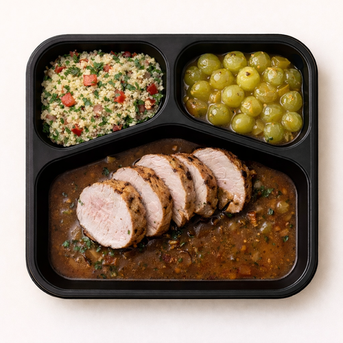 Hovězí maso s pikantní omáčkou, bylinková pohanka, zelené fazolky